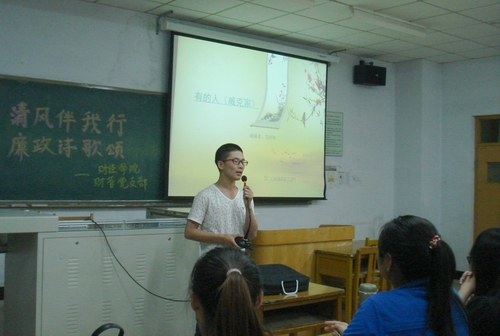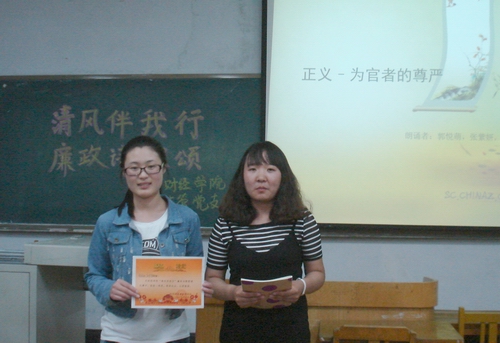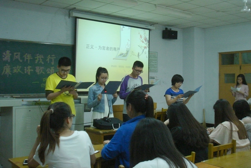 活动中,《正义——为官者的尊严》、《廉洁之歌》、《你好,我是廉政》、《烈烈清风》、《廉洁之花永远开放》、《廉政与权力》、《请不要忘记》等一首首反腐倡廉的诗歌被同学们倾情演绎,或慷慨激昂,或庄严肃穆,或娓娓动听。在场的同学既受到心灵的震撼和启迪,又得到美的享受。经过评议,活动评选出奖项并现场颁发奖状和纪念品。