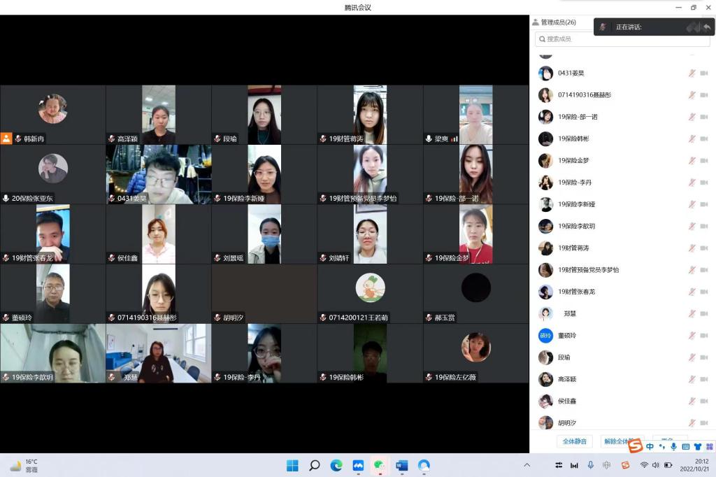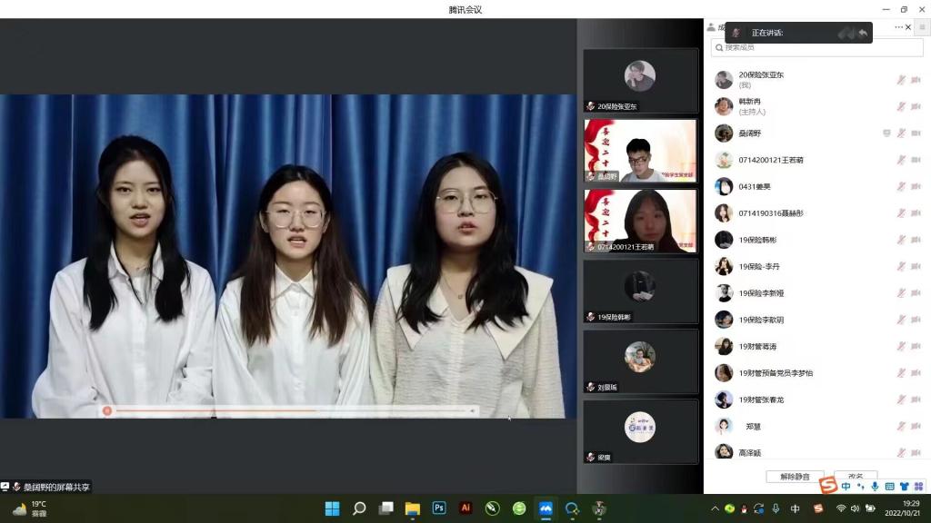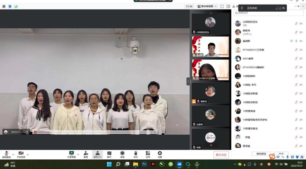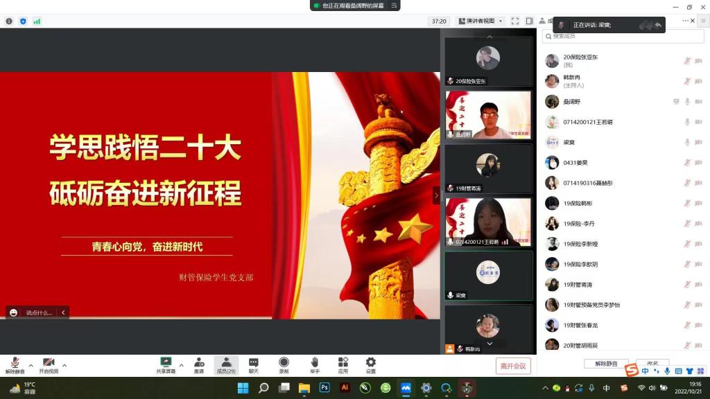 为聚力做好学习宣传贯彻党的二十大这项重要任务,团结引领支部党员坚定跟党走、建功新时代。财管保险党支部于2022年10月21日星期五晚7:00—9:00在线上腾讯会议开展了“学思践悟二十大,砥砺奋进新征程”主题党日活动,出席活动的有梁爽老师、郑慧老师,董硕玲老师,财管保险党支部全体党员。
