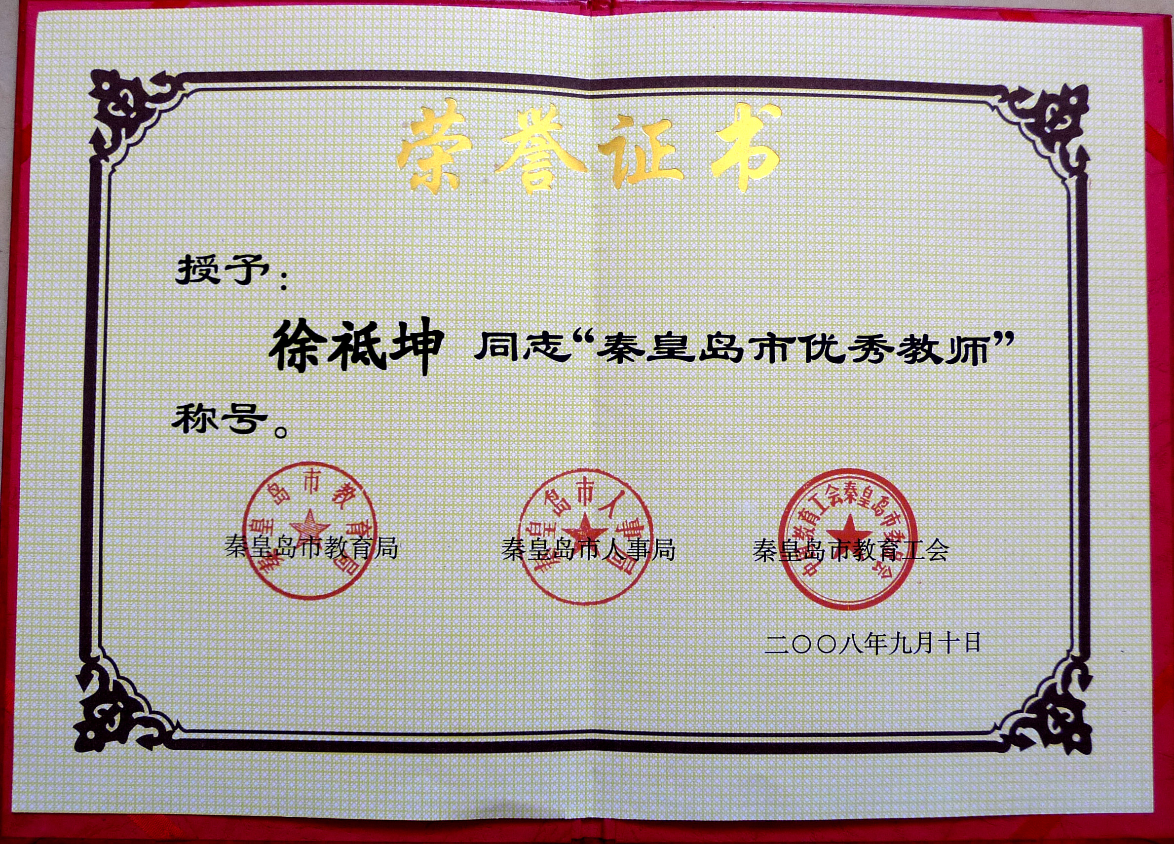 2008年秦皇岛优秀教师证书