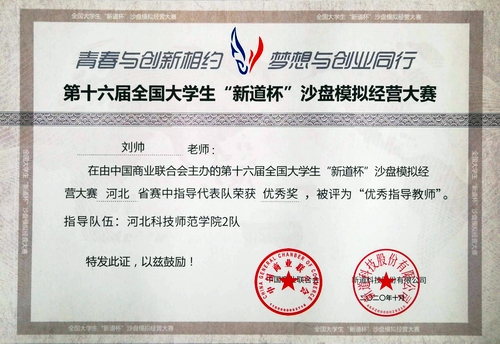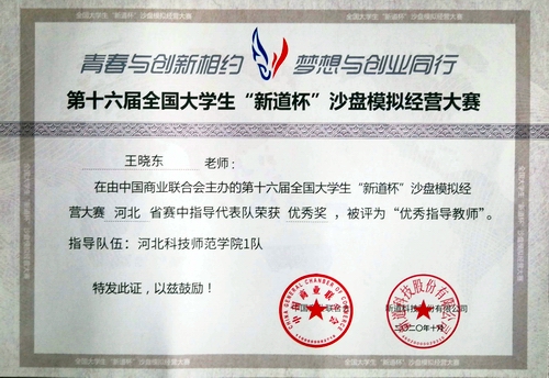 2020年10月30日,由中国商业联合会主办,河北省教育厅指导,河北省高等教育学会实验室工作分会协办,衡水学院承办,新道科技股份有限公司提供技术支持的第十六届全国老员工“新道杯”沙盘模拟经营大赛河北省赛以线上形式在衡水学院举行。经过协力拼搏,公司由关莹莹、张震、靳春、张家淇、张林浩组成的校代表队1队和由郝岩、董鹏媛、陈诗雨、刘杨帆、蒋涛组成的校代表队2队均获优秀奖。公司教师刘帅、王晓东获评优秀指导教师。(编审:王志安)