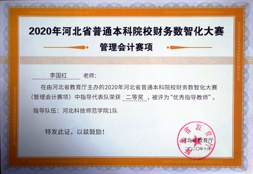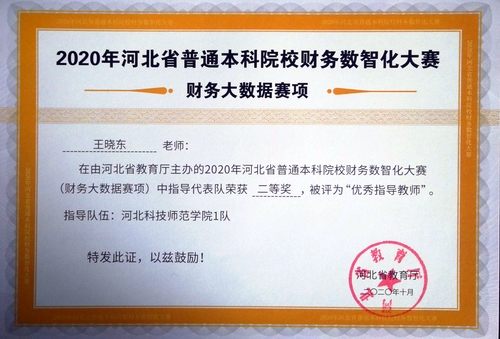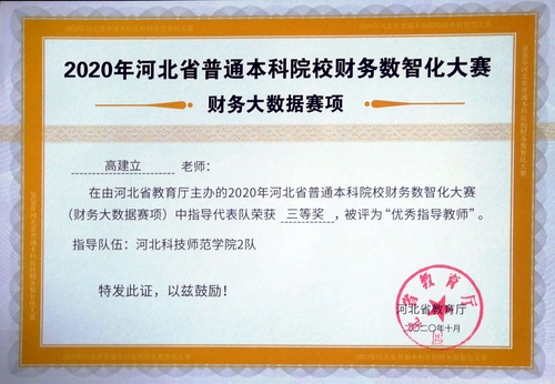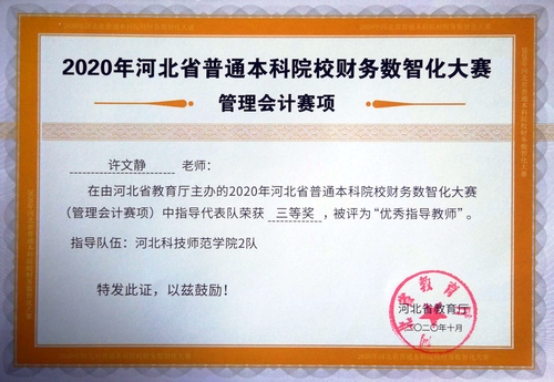 在2020年河北省普通本科院校财务数智化大赛中,学院教师高建立、王晓东、李国红、许文静指导员工获得佳绩并获得优秀指导教师称号。
