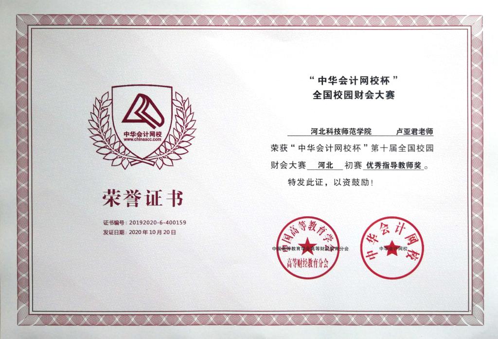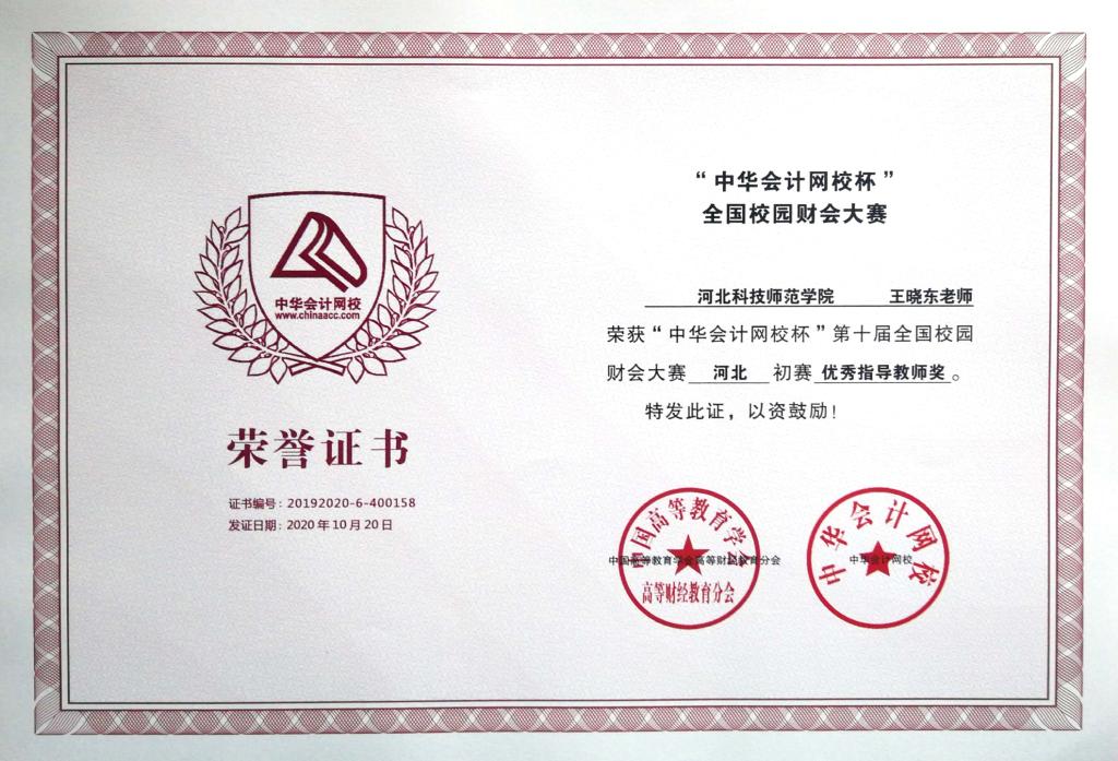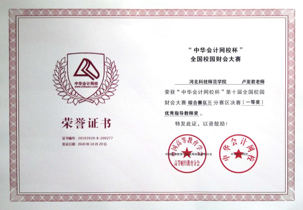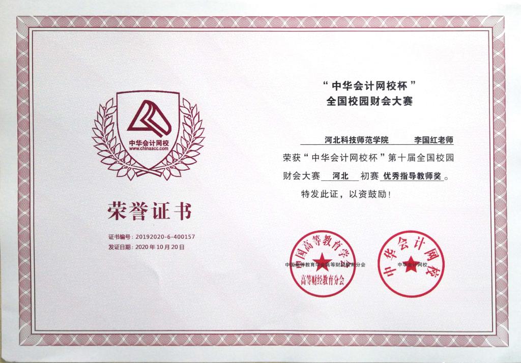 李国红、卢亚君、王晓东获第十届全国校园财会大赛优秀指导教师奖