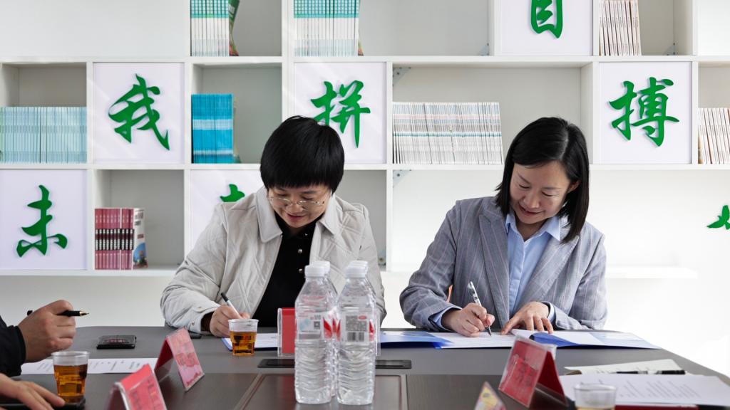 图为学院经理闫文与河北迁之味农产品开发有限公司总经理于金凤签约现场