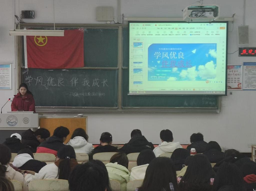 在本次11月份学风建设主题团日活动的开展过程中,每班首先进行入团宣誓、唱团歌的基本工作,然后邀请员工代表发言,对开学以来在课堂学习、课后复习、宿舍问题、自习纪律等作出经验总结。随后,各班团支书对员工应知晓的规章制度、行为守则等作出讲解,对同学们未来的学风建设作出展望。