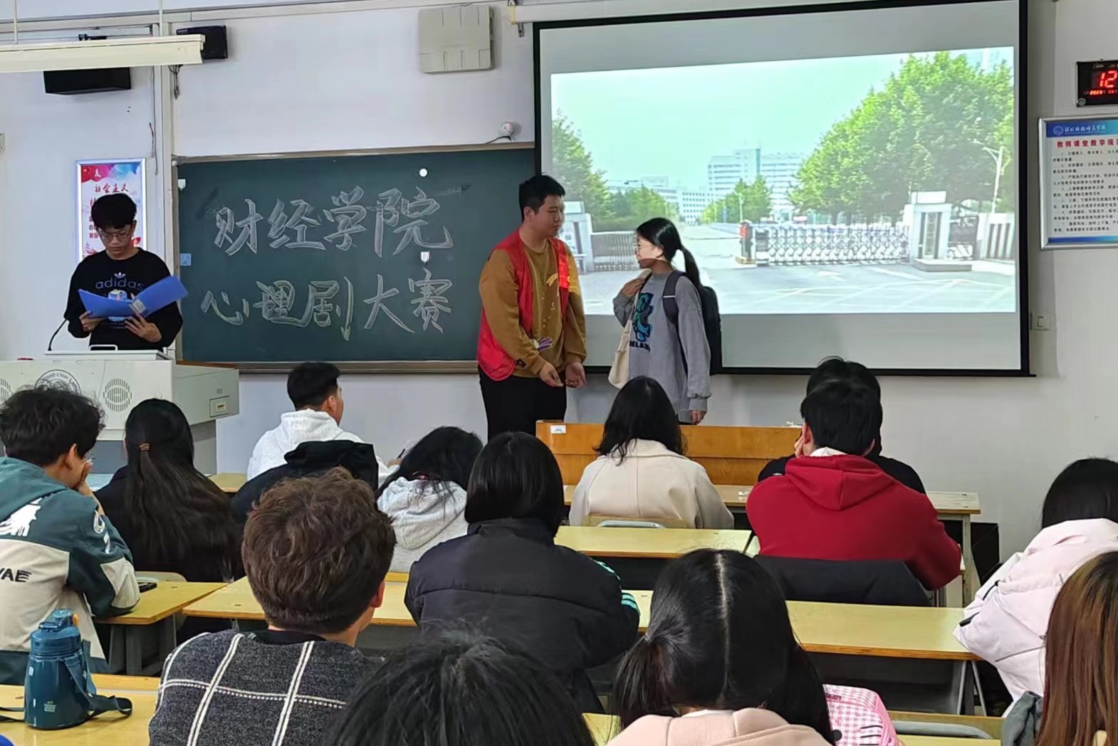 2023年11月22日,学院心理剧比赛在逸夫教学楼A614教室举办。本次比赛由学院心理健康调研会承办,主席团全体成员刘绍康、胡博雅、刘若璟、冯晨语作为评委出席比赛,冯晨语主持了比赛。30余名包括心理委员在内的同学现场观看比赛。