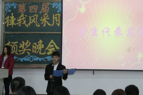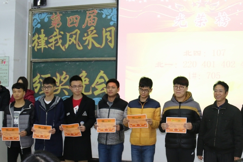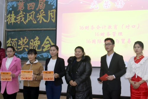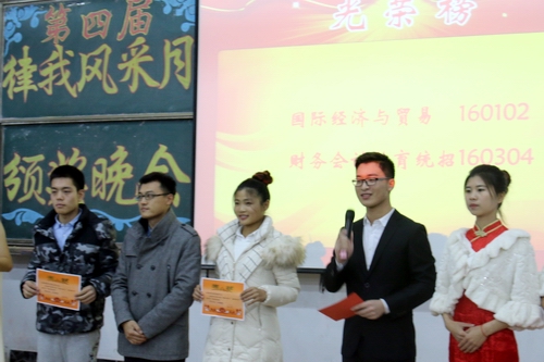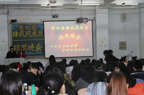 颁奖晚会上,学院领导同志和学工办辅导员为在本届“律我风采月”中评选出来的2个早操优秀团体奖、8个上课全勤奖、18个文明示范宿舍、2个优秀班集体颁发了奖状。优秀集体代表在晚会上介绍了经验做法,员工代表则表达了向先进学习的决心。晚会上表演了精彩的文艺节目并设置了现场微信关注抽奖环节。晚会在欢快祥和的氛围中落下帷幕。