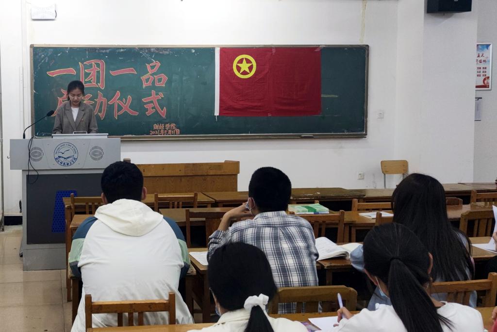 “一团一品”启动仪式共分为四项内容。第一项,学院团委组织委员刘睿琪宣读一团一品文件,并宣布学院一团一品立项班级名单。第二项,一团一品立项专业代表胡雨辰发言,表明建立特色团支部的决心。第三项,团委书记赵欣为校级“一团一品”立项专业授旗。第四项,赵欣老师讲话,对学院10个“一团一品”团支部的立项表示祝贺,鼓励各团支部高度重视特色团支部的建设,提高责任感和使命担当,将工作落到实处。(编审:王志安)