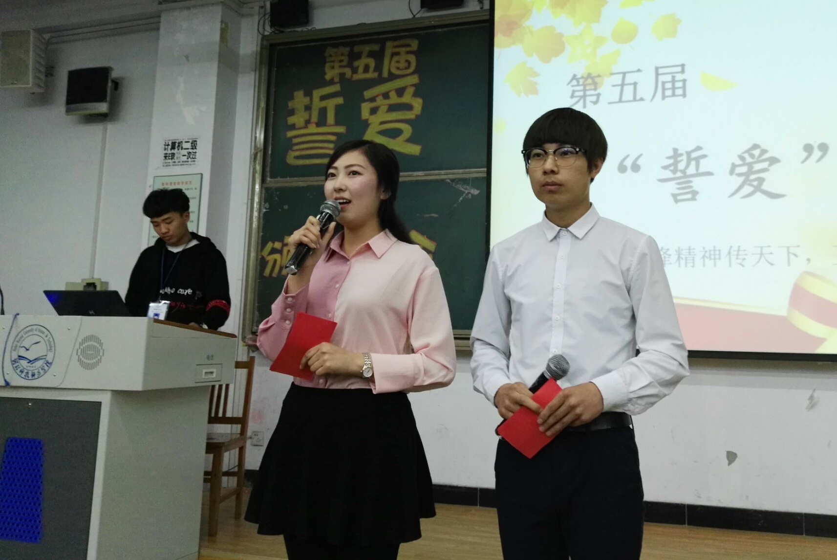 2017年4月7日晚,学院第五届“誓·爱”活动表彰晚会在B206室成功举办。公司党委副书记、副经理李宝文、学工办辅导员和200余名同学一起参加晚会。
