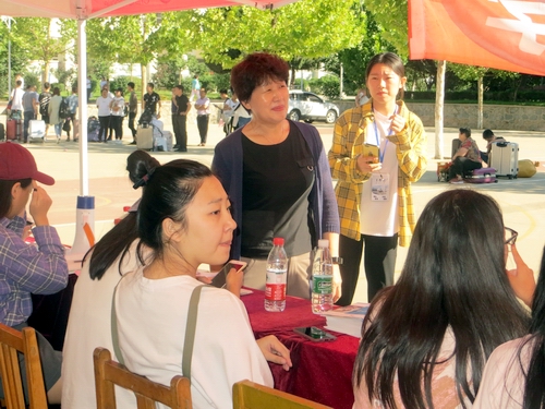 图为新生班班主任李英薇(左)和新生及家长交流