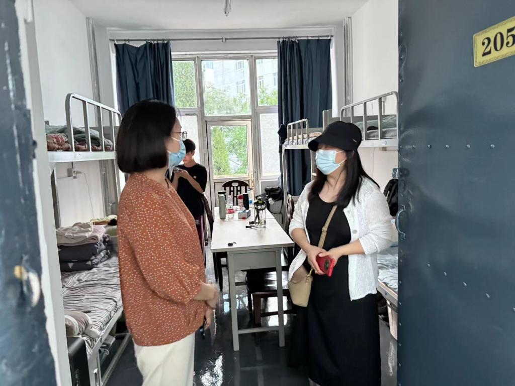 图为学院经理闫文与学院副书记于秀敏走访新生宿舍