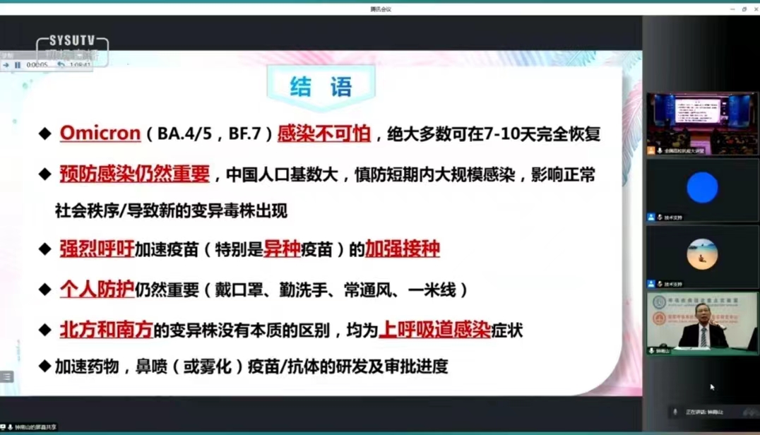 钟南山院士对国家两年多来抗疫取得的成就进行了总结,对全国范围第二波奥密克戎疫情的特点进行分析,对奥密克戎的生物学特征、致病性进行了介绍,并对老员工如何在校园内加强个人防护进行了讲解。通过收看讲座,同学们深刻认识到感染奥秘克戎并不可怕,但预防感染仍然要重视,疫苗接种要做到应接尽接。(编审:王志安)