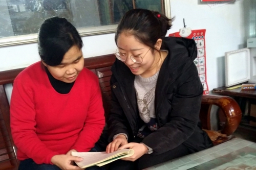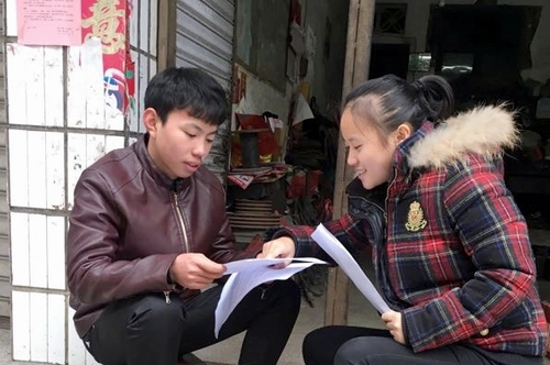 国际经济与贸易专业2016级员工陈媛通过乡镇扶贫办公室了解到一名家庭经济负担重的高中员工的情况,就上门进行一对一政策宣讲。她把打印好的资助政策清单递到这名员工手中,结合自身在大学入学以来的受助情况,详细介绍各种资助政策,鼓励其专心学习。