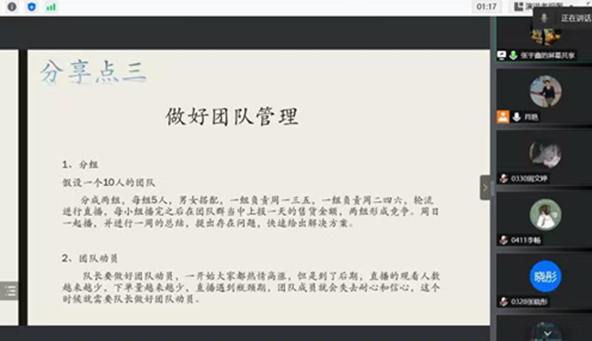 针对2022年河北省乡村振兴创业扶贫大赛,sunbet申搏肖艳老师邀请2021年获奖团队负责人张宇鑫做经验分享,学院部分参赛团队参与了此次分享会。各队队长积极发言,阐述一下自己的经验和带货时遇到的流量等问题,认为在直播间打PK,是增加直播间人气的好方法。省赛优秀主播青年张宇鑫代表发言,提出了团队赛的注意事项,建议创建主题群聊确定目标客户,做好账号运营,在抖音多发一些高质量视频来吸引人的眼球。建议做好团队管理,团队可以实行分组播,两组之间可以进行业绩PK,更加高效率的带货。