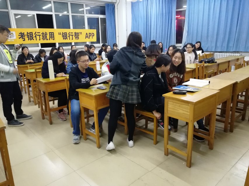 ,如何提升网申通过率,正价自己证件照和生活照的吸引力,银行面试形式及常考题型。北京课观教育有限公司向参加讲座的同学免费发放最新版银行考试真题集,还向同学们介绍一款针对银行考试的APP,整场活动氛围非常活跃,互动良好,并创建微信群,便于交流。