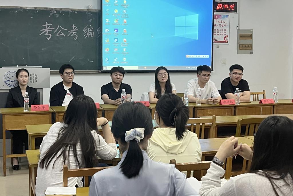 交流会上,各位嘉宾从备考时间安排、学习方法选择、学习重点难点突破、名师名课推介、报考岗位选择、笔试面试应试等多个方面分别作了详细分享。陈伟、孙昊雯重点分享了自己的笔试面试历程,赵洋重点分享了获取备考信息的渠道并推介名师名课,李靖阳强调了充分利用当年应届毕业生优势灵活报考的重要性,刘雨林则侧重分享岗位选择以及在体检方面应注意的问题,周立东对备考心态调整提供经验。各位嘉宾还详细解答了现场提问,有问必答,坦诚交流。他们鼓励同学们坚定毕业去向目标,注重长期积累提升职业素养,强调提高备考的效率,争取如愿以偿。