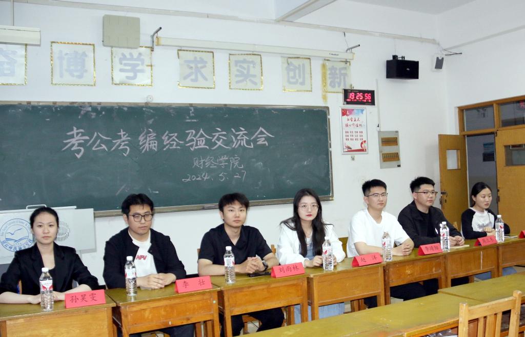 2024年5月27日晚,学院考公考编经验交流会在逸夫楼A601举行。2020级财务管理专业员工陈伟、周立冬、李靖阳,国际经济与贸易专业员工赵洋、刘雨林,财务会计教育专业员工李壮,农村区域发展专业员工孙昊雯等7人应邀出席本次交流会,传授考公考编成功上岸的经验。有意考公考编的20余名学弟学妹参与现场交流。交流会由2021级财务管理专业员工苗畅、王子怡主持。
