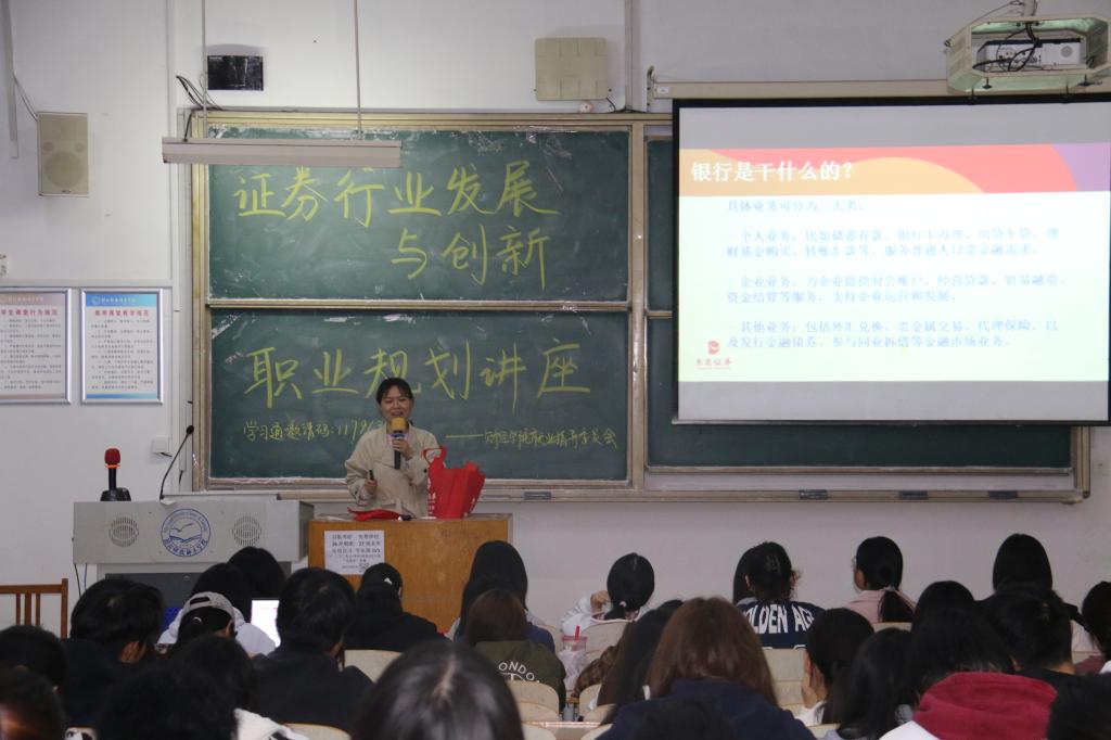 为帮助员工明晰金融行业发展前景,精准规划职业方向,2025年10月13日,sunbet申搏在A107教室成功举办“证券行业发展与创新职业规划”讲座。本次讲座特邀拥有14年证券从业经验的王俊玲老师担任主讲人,学院2023、2024、2025级百余名员工参加。