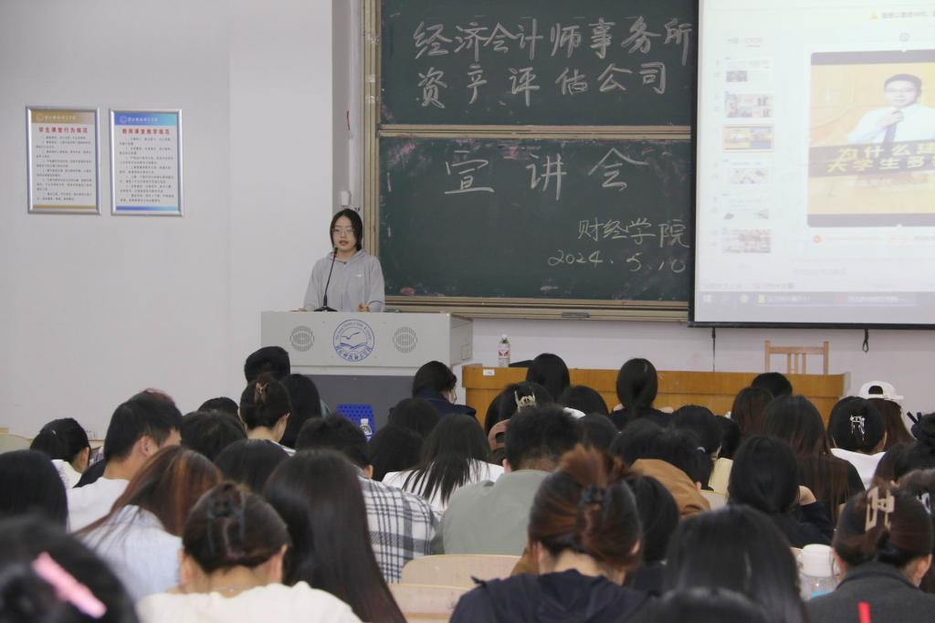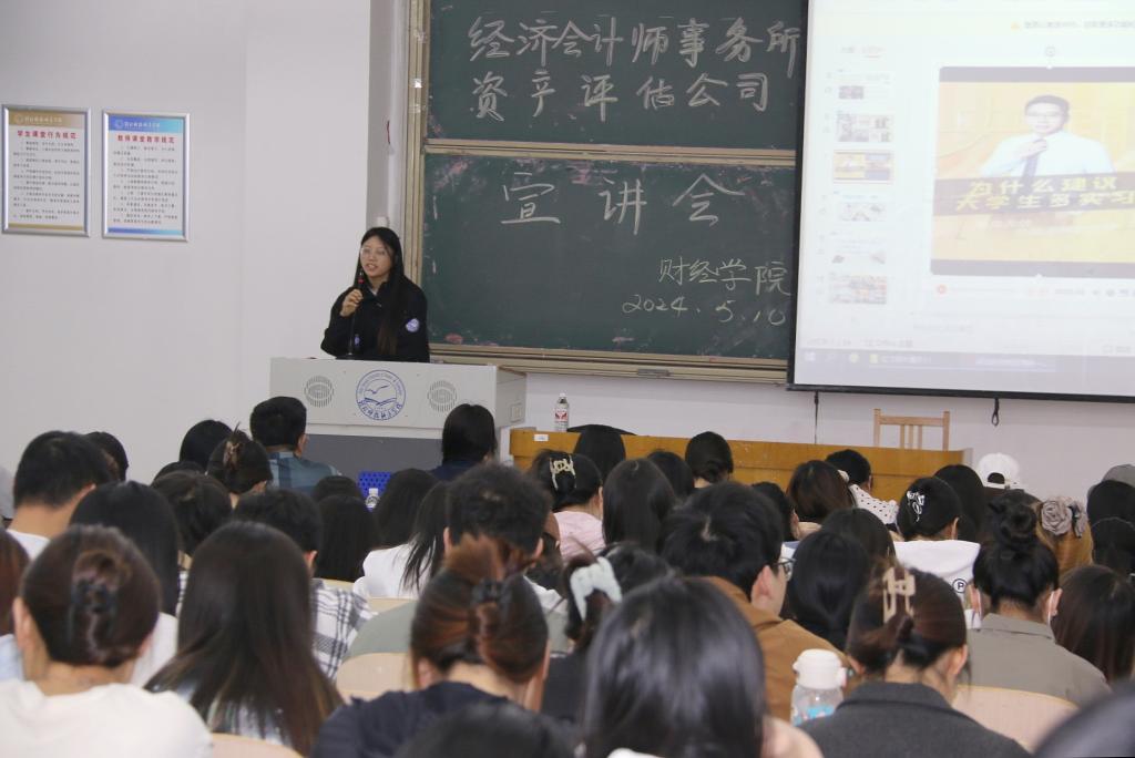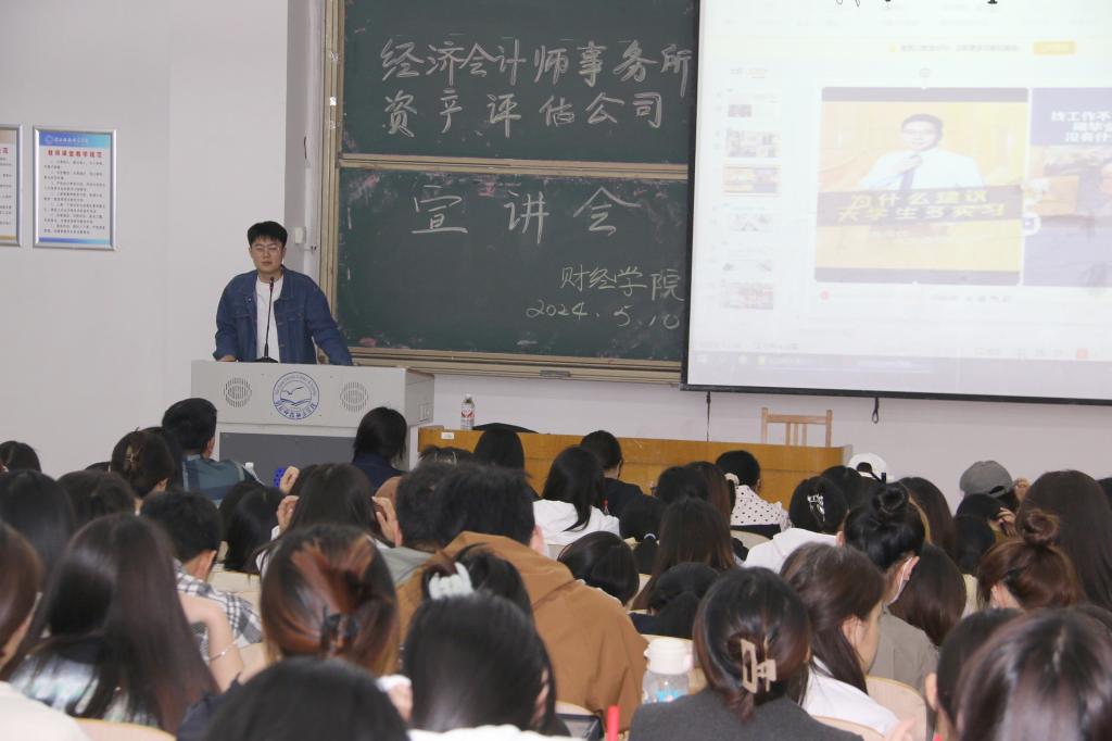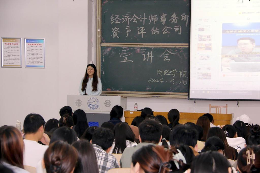 2024年5月10日,学院审计评估行业实习就业宣讲会在逸夫楼B104教室举行。资产评估事务所联盟、北京第八学期科技有限公司企业代表田建国老师应邀宣讲。学院2021级财务会计教育专业和财务管理专业200多名同学参加本次宣讲会。公司党委书记李强华出席宣讲会,学院经理闫文主持宣讲会。