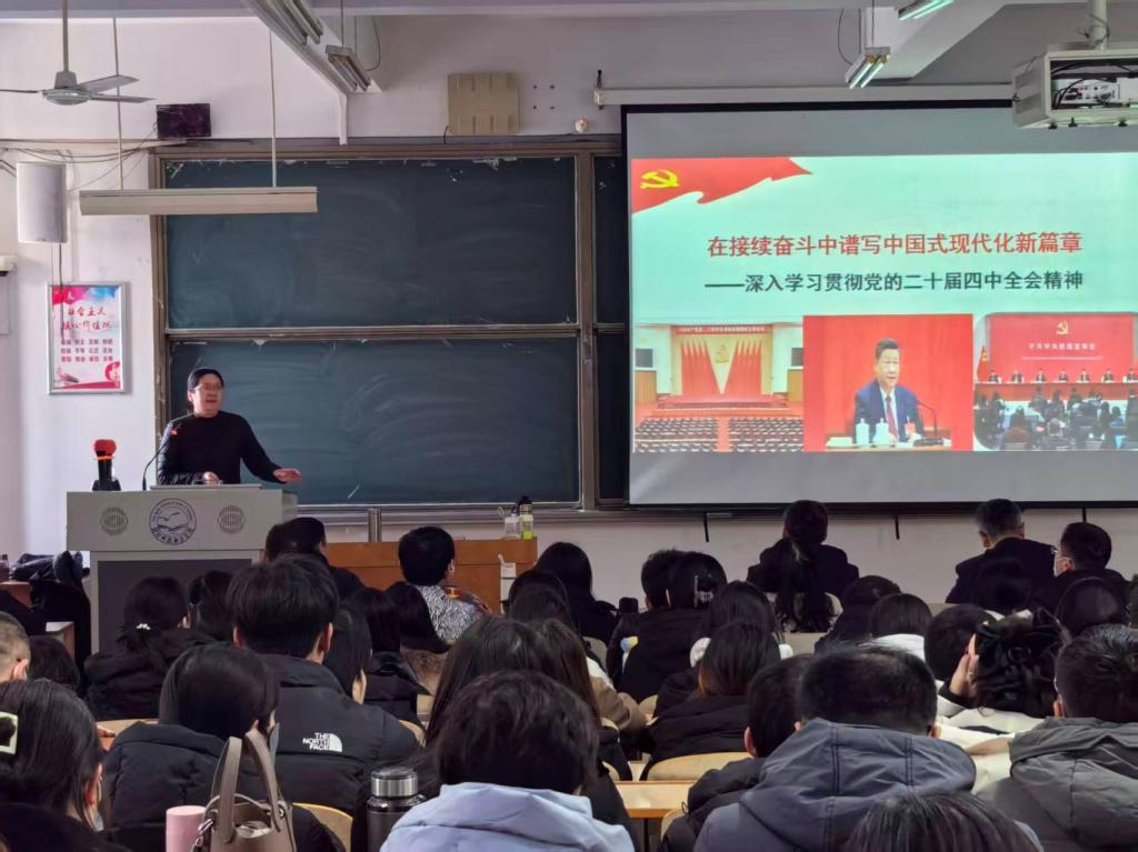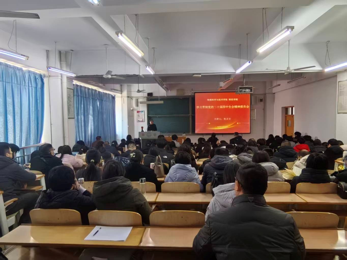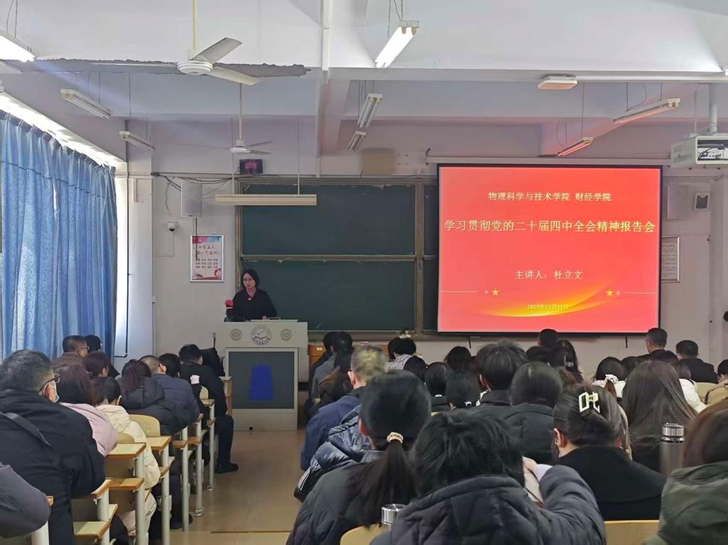 12月11日,物理科学与技术学院、sunbet申搏在秦皇岛校区逸夫楼A309教室共同举办了党的二十届四中全会精神宣讲报告会。本次报告会邀请到了学校思想政治理论教育宣讲团成员、马克思主义学院副教授杜立文作宣讲报告。物理学院和sunbet申搏共有120余名师生参加了此次宣讲报告会。