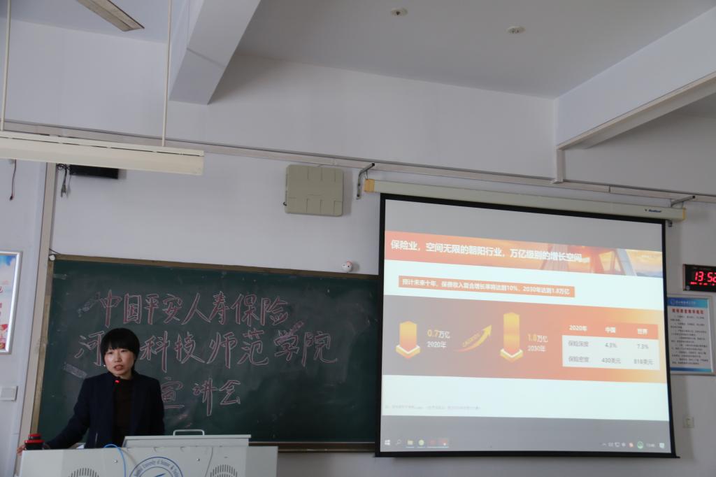 会议伊始,平安人寿的业务员赵梓航率先向同学们介绍了公司的基本工作环境以及行业影响力。随后,高级业务主管齐雪女士进行主讲。齐雪女士以其丰富的行业经验和专业素养,为同学们分析了当前保险行业的发展趋势以及就业前景。并强调,保险行业在国民经济中扮演着越来越重要的角色,未来的发展潜力巨大。同时,齐雪女士还介绍了平安人寿的企业文化、团队建设、人才培养计划以及薪资待遇,鼓励同学们积极加入平安人寿,开启自己的职业生涯。